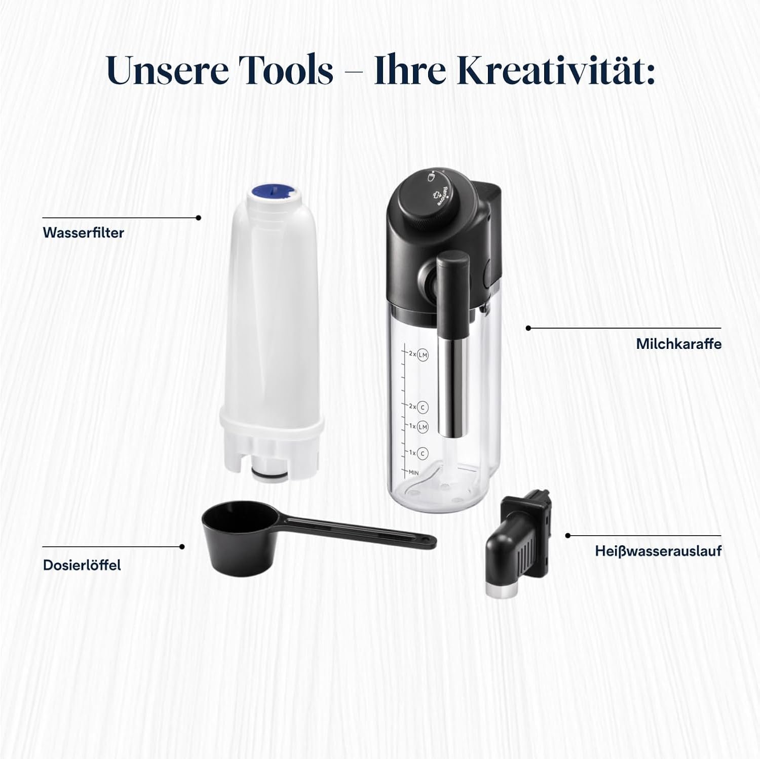 Die Milchkaraffe reinigt sich auf Knopfdruck automatisch. Die kratzfeste Abtropfschale mit spülmaschinenfestem Gitter minimiert den Reinigungsaufwand. Das schlanke Design mit 24 cm Breite passt auch in kleine Küchen.